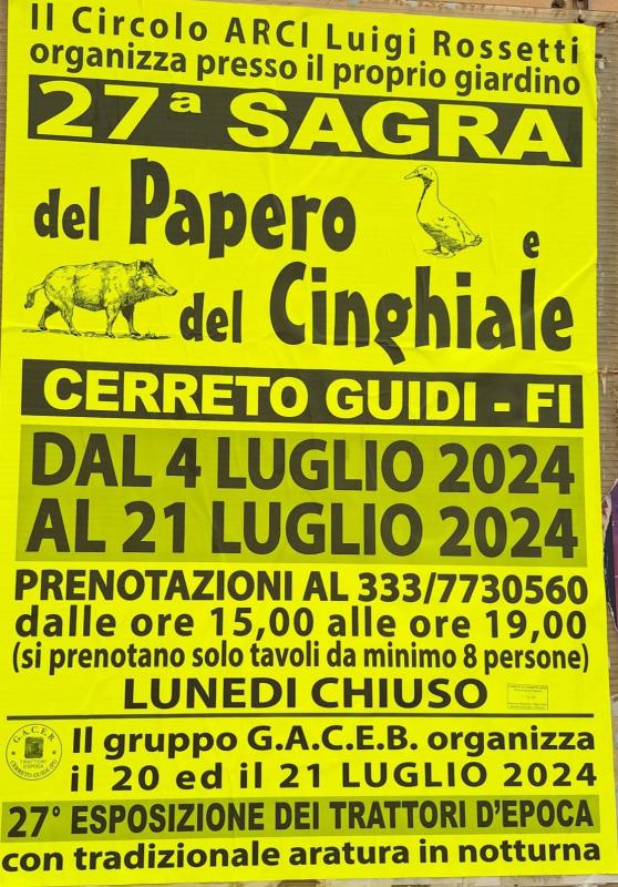 La Sagra del Papero e del Cinghiale al Circolo Arci di Cerreto Guidi si svolge dal 4 al 21 Luglio 2024.