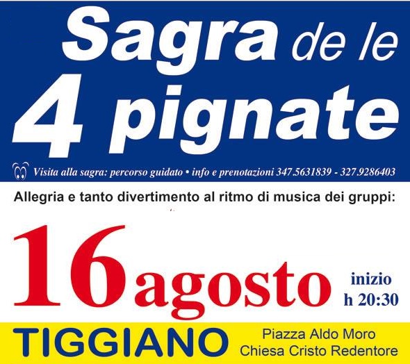 La comunità di Tiggiano organizza il 16 agosto in Piazza Aldo Moro la 15° edizione della "SAGRA DE LE PIGNATE", una serata da non perdere all'insegna della riscoperta dei sapori e delle tradizioni di una volta che la vita frenetica quotidiana ha fatto dimenticare. In una splendida cornice si potranno degustare le pietanze tipiche del salento,preparate con sapiente maestria dalle mani delle massaie del posto nel rispetto dell'antica tradizione utilizzando prodotti a Km 0 esaltandone così il loro inconfondibile sapore.