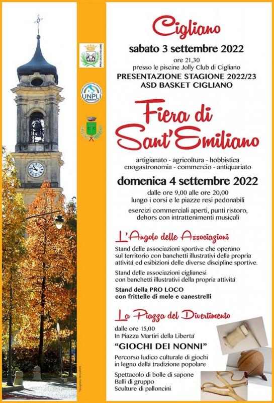 Domenica 04 Settembre 2022 si svolge la Fiera Di Sant'Emiliano a Cigliano durante la Festa Patronale.