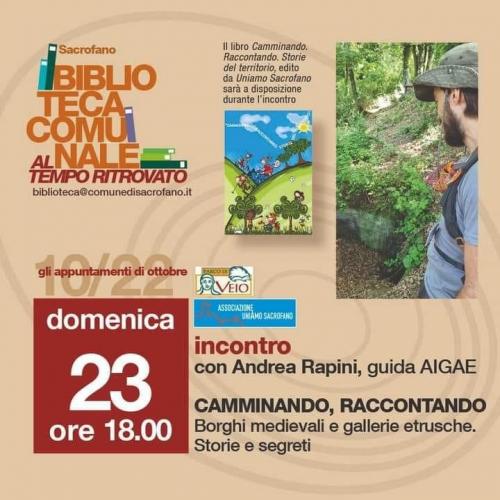 Si potrà, inoltre, assistere a fine giornata alla narrazione e scoperta del territorio di Sacrofano e dei suoi tesori nascosti, ville romane, cunicoli e tombe etrusche, sentieri naturalistici di Monte Musino attraverso i racconti della guida locale AIGAE Andrea Rapini. Biblioteca Comunale ‘Al tempo ritrovato’ Piazza Ugo Serata - Ore 18,00.