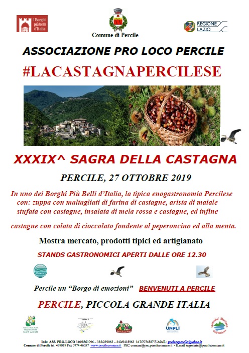 Percile, piccolo borgo dell'Alta Valle dell'Aniene, posto all'interno dell'area protetta regionale del Parco dei Monti Lucretili, ed uno dei Borghi più Belli d'Italia, domenica 27 ottobre 2019 ospiterà la XXXIX edizione della Sagra delle Castagne con un ricco menù a base del prelibato frutto.