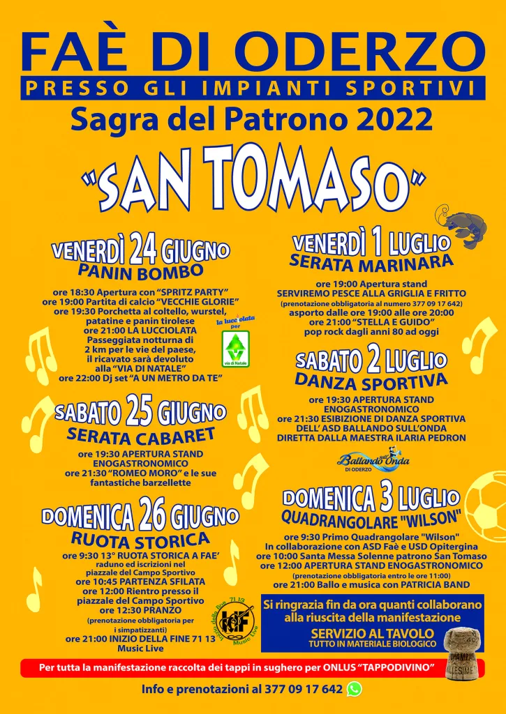 Diniego di responsabilià: le notizie riportate in questa pagina sono state fornite da Enti Pubblici e Privati e, organizzazione eventi e sagre, fiere. Suggeriamo di verificare date, orari e programmi che potrebbero variare, contattando le organizzazioni o visitando il sito ufficiale dell'evento.