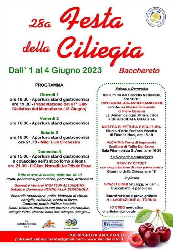 La tanto attesa Festa della Ciliegia torna a Bacchereto per la sua 29ª edizione! Un evento imperdibile dedicato a tutti gli amanti delle ciliegie e della buona cucina. Unisciti a noi per celebrare questo frutto delizioso e per gustare un menu ricco e variegato!