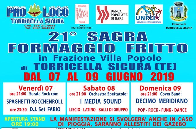La 21° edizione della Sagra del Formaggio Fritto a Villa Popolo di Torricella Sicura (TE) si svolge il 7 - 8- 9 giugno 2019.