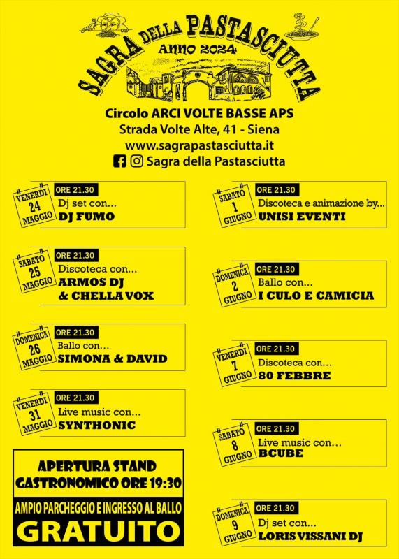 la Sagra della Pastasciutta. a Siena si svolge nei giorni dal 24, 25, 26, 31 Maggio e 1, 2 e 7, 8, 9 Giugno 2024