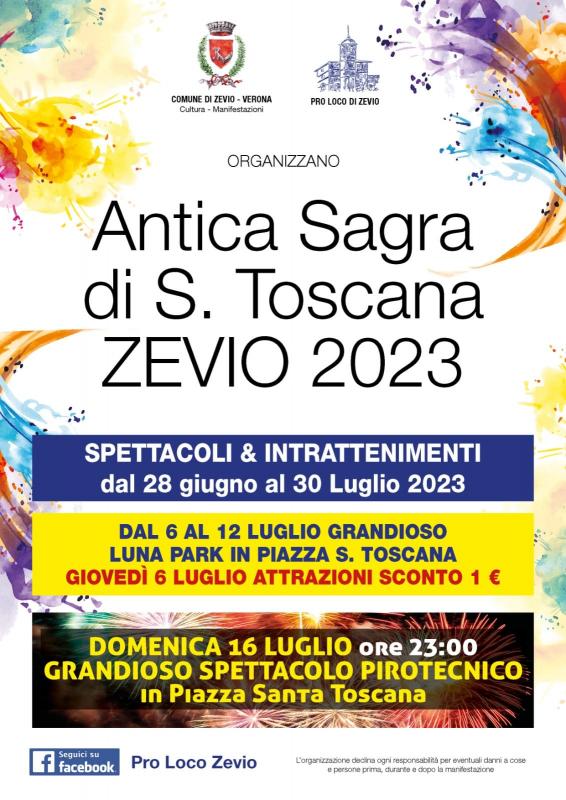 Dal 28 giugno al 30 Luglio 2023 a Zevio si tiene la Sagra di Santa Toscana, uno dei principali appuntamenti tra i tantissimi eventi dell'Estate Zeviana.