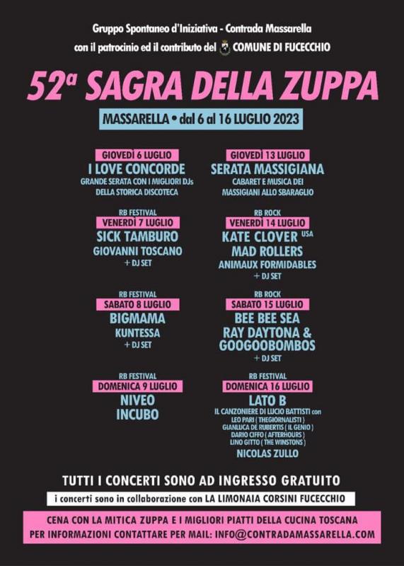 La storica Sagra della Zuppa , alla sua 52° edizione, torna anche quest'anno con una line up piena di nomi conosciuti e di artisti sulla rampa di lancio! Da noi si mangia da dio e si ascolta musica pazzesca, sia durante i concerti che per gli after party.