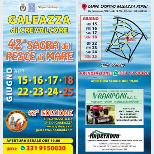 La Sagra del Pesce di Mare di Galeazza, frazione di Crevalcore (BO), si svolge nei giorni 15-16-17-18--21-22-23-24-25 Giugno 2023