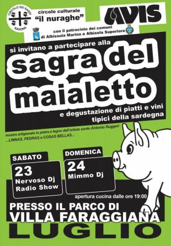 Il 23 e 24 luglio 2016 al Parco Faraggiana di Albissola Marina si svolge la Sagra del Maialetto, organizzato da Avis comunale di Albissola e Associazione Nuraghe di Savona, dove si può gustare il maialetto sardo, cucinato secondo tradizione e delizie sarde.