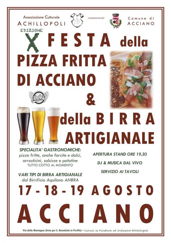 L'Associazione Culturale Achillopoli, con il contributo ed il patrocinio del Comune di Acciano, vi invita tutti nelle serate da sabato 17 a lunedì 19 agosto a scoprire il borgo medievale di Acciano e ad assaporare la tipica pizza fritta, realizzata secondo un'antica e rinomata ricetta e proposta in diverse varianti: la classica; quella farcita con mozzarella e pomodoro; la "Tricolore" con speck, rucola e grana; quella con i peperoni e la cipolla; oppure, per dolce, con lo zucchero o con la Nutella!