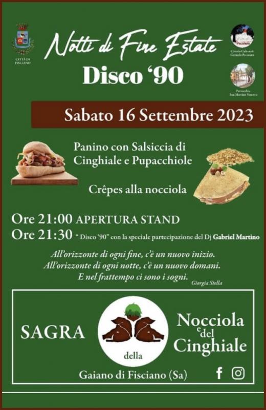 La Sagra della Nocciola e del Cinghiale a Gaiano di Fisciano (SA) quest'anno non si svolge ma al suo posto Sabato 16 Settembre 2023 si terrà la Festa di fine Estate con panino con salsiccia di cinghiale e pupacchiole e crepes alla nocciola.