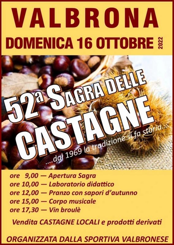 L’appuntamento autunnale da non perdere in Valbrona! …….si svolgerà Domenica 16 Ottobre 2022 la 52ª edizione della Sagra delle Castagne organizzata dalla SPORTIVA VALBRONESE presso l’area feste comunale, in collaborazione con i produttori locali di castagne,