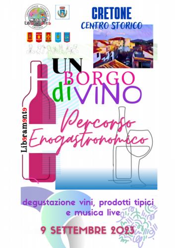 UnBorgoDiVino ritorna con la 10^ Edizione della Sagra dei Longarini e del Ciammellocco. Evento dedicato alla degustazione di ottime etichette enolologiche territoriali e nazionali, allestito nel Centro Storico di Cretone, località conosciuta anche per le Terme Sabine. Ad accompagnare le degustazioni, verrà allestita anche una vasta area gastronomica dove il pubblico potrà deliziarsi con piatti tipici locali. Da segnalare i Longarini di Cretone che sono una pasta fresca ottenuta con solo due ingredienti: acqua e farina tipo 0 e il Ciammellocco, dalla classica forma di ciambella, preparata con un umpasto ricco di profumi a base di farina, lievito madre, anice olio extravergine di oliva, vino bianco, buccia di limone grattugiato, anisetta, mistrà, sale e uova. Una peculiarità che più lo caratterizza è la lievitazione naturale piuttosto lunga, basti pensare che per prepararlo occorono circa due giorni. I longarini e il Ciammellocco sono prodotti agroalimentari tradizionali PAT riconosciuti nell'elenco Nazionale.