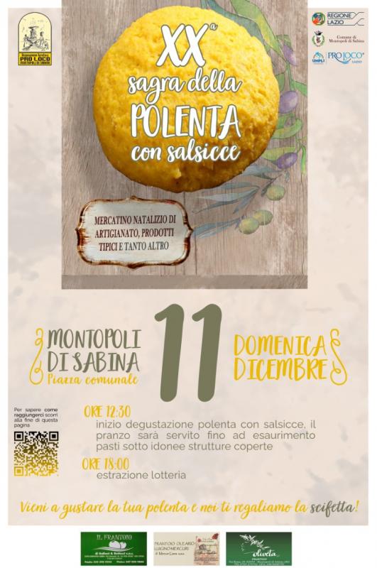 Sarà possibile consumare il proprio pasto a partire dalle ore 12:30 in adeguate strutture coperte fino ad esaurimento. Il menù comprende pane e olio d’oliva gentilmente donato dai tre Frantoi di Montopoli di Sabina: Luigino Mercuri, Galloni & Bettucci e Oliveta. Una porzione di Polenta con sugo e due salsicce servita su una scifetta di legno che alla fine della festa potrete portare a casa con voi come omaggio offerto dalla Pro Loco di Montopoli di Sabina. Il pasto si concluderà con una porzione di ceci all’uccelletto. Sarà inoltre possibile gustare anche una versione vegetariana con sugo di pomodoro.