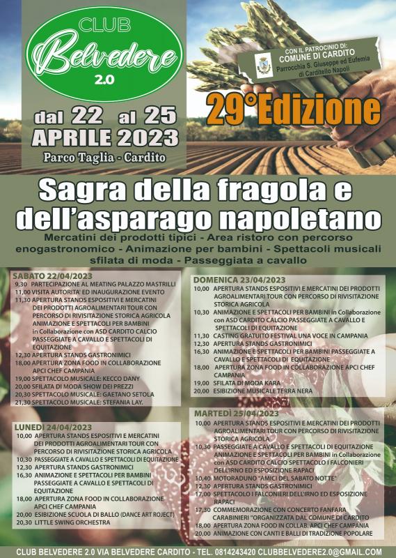Torna anche quest’anno, dopo il successo delle precedenti edizioni, la 29esima edizione della Sagra della Fragola e dell’Asparago che si svolgerà dal 22 al 25 Aprile 2023 a Carditello in provincia di Napoli. Un’iniziativa che vede coinvolti produttori agricoli, giovani che hanno ereditato la passione per la propria terra e tutti gli appassionati di agricoltura biologica a kilometro zero.