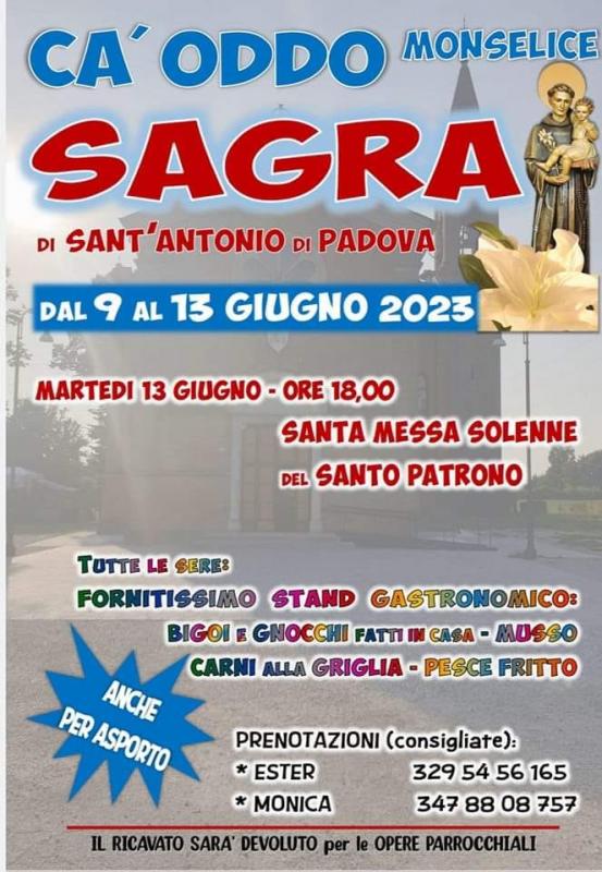 Sagra di Sant'Antonio a Ca Oddo di Monselice dal 9 al 13 Giugno 2023, tutte le sere stand gastronomico