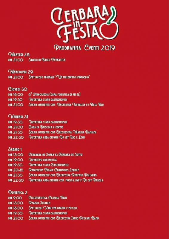 In questa manifestazione, organizzata dalla Pro Loco di Cerbara, sarà possibile degustare, negli stands gastronomici. varie specialità della cucina locale e le ciliege saranno le protagoniste della festa.