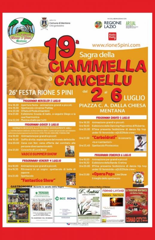 Dal 02 al 06 Luglio 2025 a Mentana torna la 19a Sagra della Ciammella a Cancellu e la 26a Festa Rione 5 Pini.