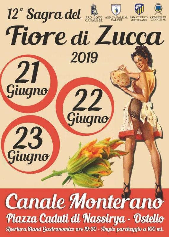 La 12^ edizione della Sagra del Fiore di Zucca a Canale Monterano si tiene nei giorni di venerdì 21, sabato 22, domenica 23 giugno 2019 con un menù sfizioso di piatti tipic e intrattenimento musicale in piazza Caduti di Nassirya.