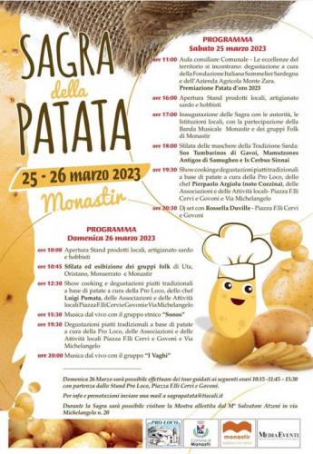Torna la Sagra della Patata a Monastir Sabato 25 e Domenica 26 Marzo 2023, evento in cui si trova cultura, tradizione, degustazioni, show cooking e spettacoli.