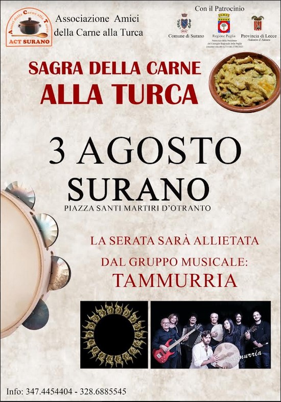 Un piatto, un paese. Sarà nel segno dell'unicità la sagra della carne alle turca, inserita in passato nel circuito delle "Sagre del Capo di Leuca" La pietanza regina della manifestazione, che si svolgerà in Piazza SS. Martiri d’Otranto a Surano nel giorno 3 agosto 2023 , affonda le sue radici in una storia molto particolare: quella di Peppino, un attore comico di teatro che, giunto in paese con la sua compagnia itinerante, rimase "stregato" e decise di diventarne uno degli abitanti.