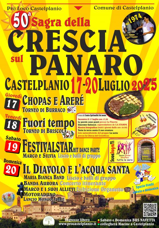La tradizionale Sagra della Crescia sul panaro a Castelplanio giunge alla 50a edizione; quattro giorni, da giovedì 17 a domenica 20 luglio, all’insegna del mangiare e di tanta musica; a farla da padrona sarà la tradizionale crescia di polenta, ovvero la crescia ottenuta mescolando la polenta con la farina di grano tenero; la semplice ricetta ha origine dalla tradizione che riutilizzava la polenta avanzata facendone cresce salate e dolci.La crescia è un pasto leggero in quanto l’impasto NON contiene grassi.Viene condita in vari modi, dai più tradizionali (verdure, verdure più salsiccia, salsiccia), ai più recenti (prosciutto, prosciutto e verdure) fino alle recentissime vegetariane con verdure e/o pecorino; c’è poi la versione golosa: crescia dolce fritta che può anche essere farcita di Nutella!Durante la sagra, la crescia verrà prodotta tutta manualmente: impasto, spianatura, cottura e farcitura.