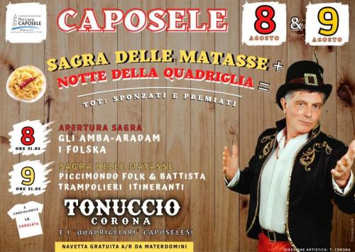 La Sagra delle Matasse di Caposele, uno degli appuntamenti enogastronomici più longevi d’Irpinia, che da quasi 50 anni propone le ricette della sua pasta a mano più tradizionale, quest’anno raddoppia l’offerta e aggiunge alla data classica del 09 Agosto, anche il 08! Un altro giorno in cui potrete degustare oltre alle nostre due ricette classiche, le Matasse e ceci o al filetto di pomodoro, anche le versioni con alcuni altri condimenti realizzati utilizzando prodotti di grande qualità delle nostre terre, come i ceci neri o i fagioli con l’occhitiello, eccellenze di tutta la l’Alta Irpinia e della Valle del Sele! Un giorno in più, per divertirsi insieme all’insegna delle nostre belle e buone tradizioni! Vi aspettiamo tutti l’8 e il 9 Agosto alla Sagra delle Matasse di Caposele!