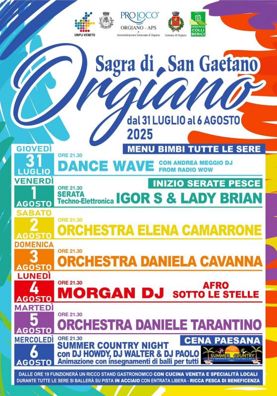 Ad Orgiano in provincia di Vicenza si svolge nei giorni dal 31 luglio al 6Agosto 2025 la nuova edizione della Sagra di San Gaetano.