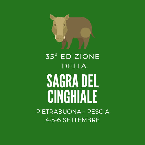 L'associazzione Civile Progresso e Civiltà con il Patrocinio del Comune di Pescia organizza la sagra del cinghiale dal 4 agosto al 6 settembre 2020 a Pietrabuona. Dalle ore 20.00 stand gastronomici con varie specialità toscane e a seguire intrattenimenti e iniziative.