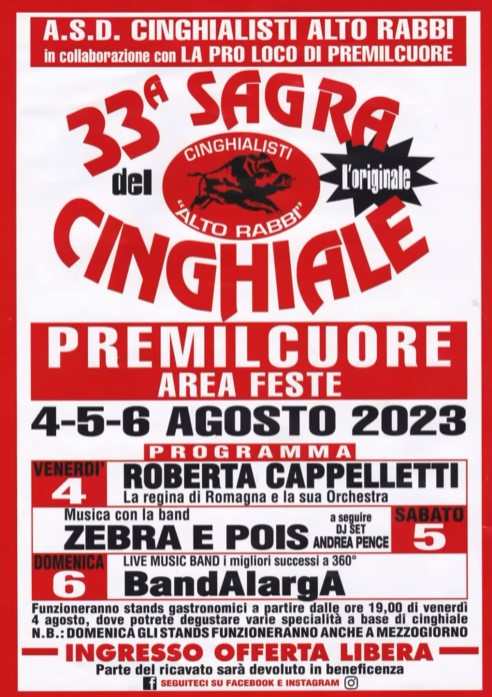 La 33^ edizione della Sagra del cinghiale a Premilcuore (FC) si svolge nei giorni di Venerdì 04 - Sabato 05 - domenica 06 Agosto 2023