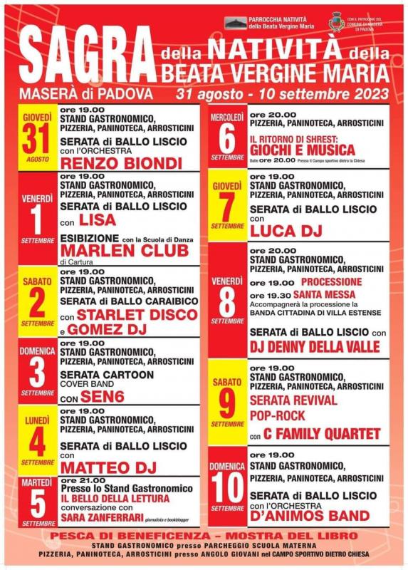 La Sagra della Natività della Beata Vergine si svolge a Maserà di Padova dal 31 agosto al 10 Settembre. L’evento, organizzato dalla Parrocchia e patrocinato dal Comune di Maserà di Padova, coniuga serate danzanti e di musica leggera nel contesto del Parco della Libertà di Maserà ai piatti dello stand gastronomico e alle pizze e i panini della pizzeria al parco. Il quadro è completato da una ricca lotteria, dalle mostre e altre attività organizzate durante la festa che annualmente anima la nostra comunità. Le prestazioni lavorative sono offerte esclusivamente da personale volontario. Navigando il sito www.sagradimasera.it troverete tutte le informazioni per raggiungerci, i menù nonché il programma della manifestazione.