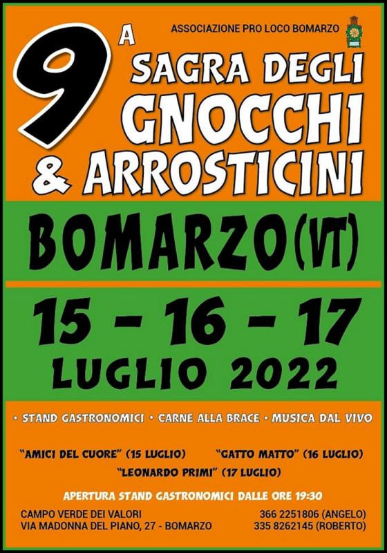 Presso il Campo Verde dei Valori in Via Madonna del Piano 27 a Bomarzo in provincia di Viterbo si svolge nei giorni 15, 16, 17 Luglio 2022 la 9a edizione della Sagra degli Gnocchi e Arrosticini.