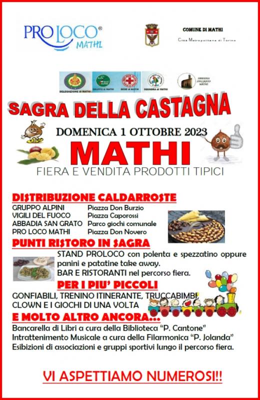 Il 01 Ottobre 2023 presso il comune di Mathi si terrà la consueta Sagra della Sastagna e dei Prodotti d'Autunno.