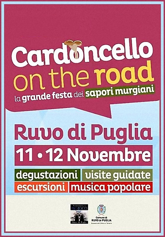A Ruvo di Puglia in provincia di Bari si svolge nei giorni 11 e 12 Novembre Sagra Del Fungo CardoncelloCardoncello on the road la festa dei sapori murgiani,  colori, profumi e sapori attraverso degustazioni, visite guidate, laboratori, trekking nella natura, convegni tematici e spettacoli dal vivo in un un weekend alla scoperta della natura e di una selezione di prodotti enogastronomici e di qualità.
