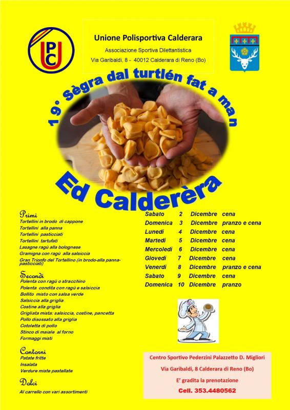 La Sègra dal Turtlèn ed Calderèra , Sagra del Tortellino di Calderara si svolge dal 2 al 10 dicembre 2023 al palazetto dello sport di via Garibaldi.