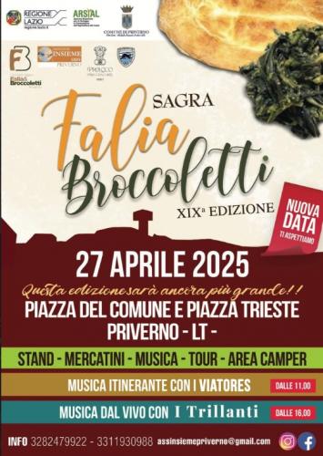 Sta per tornare, a Priverno, il tanto atteso appuntamento con la Sagra Falia & Broccoletti, la grande kermesse gastronomica e culturale, giunta alla sua XVIII edizione, organizzata dal Comitato Sagra Falia e Broccoletti, con il Patrocinio del Comune di Priverno e in collaborazione con le Associazioni Insieme Odv e Centro Operativo Circe.