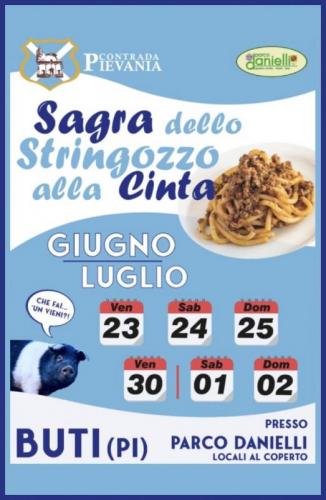 Dall'unione di due eccellenze della cucina toscana, lo stringozzo o strozzaprete e la rinomata carne della cinta senese, nasce la ricetta a cui è dedicata la sagra organizzata dalla Contrada Pievania del Palio di Buti. Insieme agli Stringozzi alla Cinta, il menù prevede altre specialità tipicamente toscane.