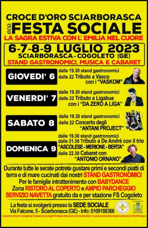 Da Giovedì 06 a Domenica 09 Luglio 2023 torna la Sagra Estiva organizzata dalla Croce d'Oro a Sciarborasca sulle alture di Cogoleto in provincia di Genova. Anche quest'anno la tradizionale festa vi allieterà con quattro serate enogastronomiche, musica e divertimento assicurato per grandi e piccini! La tradizionale "ECO FESTA SOCIALE" vi aspetterà tutte le sere alle ore 19.30 con Stands Gastronomici (Ristorante, Braceria, Friggitoria e Bar) ed i Giochi a Premi. Naturalmente non mancheranno la Musica rigorosamente dal Vivo e le attrazioni per grandi e piccini! Un occhio di riguardo anche per i più piccoli: l'Animazione dei nostri giovani volontari farà divertire i vostri bimbi tutte le sere della Sagra con Baby Dance, Truccabimbi, Palloncini, Disegnabimbi e Giochi all'aria aperta.