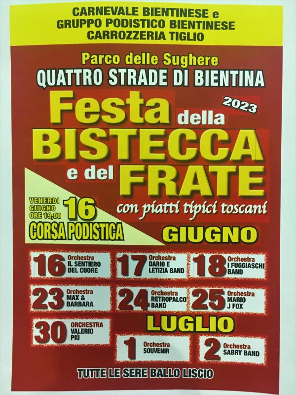 Festa della Bistecca e del Frate in programma presso il Circolo Ricreativo "il Risorgimento" Località Quattro Strade, Via del Ghinghero 2, Bientina (PI) nei giorni di giugno 16,17,18 - 23,24,25 e 30 e a luglio 1 e 2