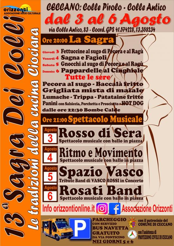 la Sagra Dei Colli, evento dedicato alle tradizioni della Cucina Ciociara, si svolge a Ceccano, in località Colle Pirolo - Colle Antico, dal 3 al 6 Agosto 2023