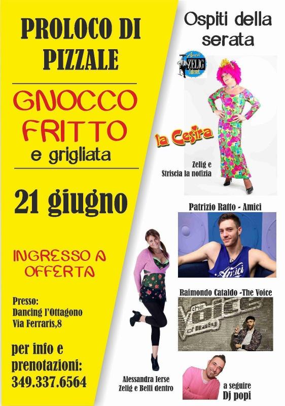 Noi della Pro Loco di Pizzale vi aspettiamo presso il Dancing l'Ottagono (Via Ferraris n° 8) il 21 giugno dalle ore 20,00 per una cena a base di gnocco fritto e/o grigliata e una serata piena di ospiti: la Cesira da Zelig e Striscia la Notizia, Patrizio Ratto da Amici, Raimondo Cataldo da The Voice, Alessandra Ierse da Zelig e Belli Dentro e per concludere si balla tutti insieme con Dj Popi.