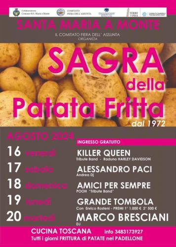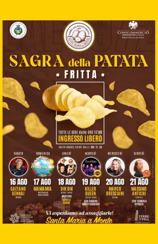 Metti una bella serata d'estate...metti che non hai voglia di cucinare ma vuoi mangiare qualcosa di tradizionale, di buono, in una bella cornice dal sapore medievale e con spettacoli GRATUITI, metti che le PATATE FRITTE siano il tuo piatto preferito...ecco, allora che abbiamo la risposta dal 16 al 21 agosto a SANTA MARIA A MONTE torna la SAGRA DELLA PATATA FRITTA