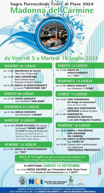 Sagra di Croce di Piave , nel comune di Musile di Piave (VE) la sagra della madonna del carmine si svogle nei giorni 5, 6, 7, 9, e 12, 13, 14, 15, 16 Luglio 2024