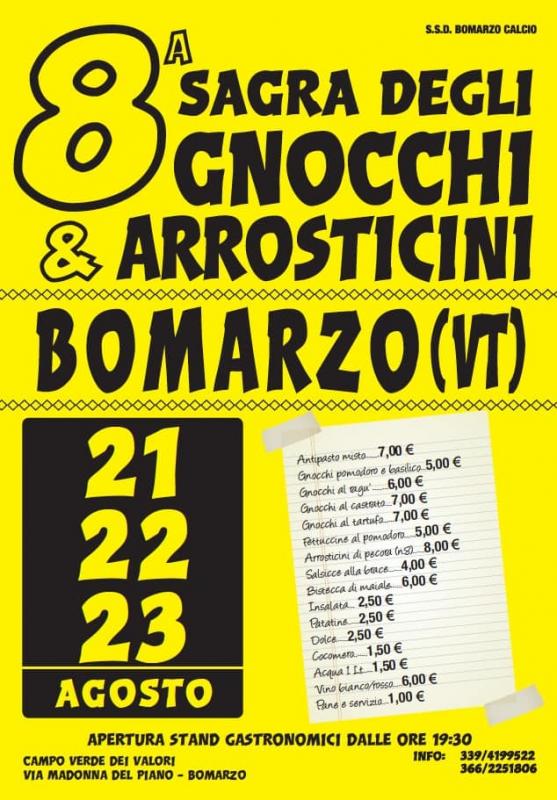 °Sagra degli gnocchi e arrosticini il 21-22-23 Agosto, al Campo Verde dei Valori in Via Madonna del Piano a Bomarzo (VT