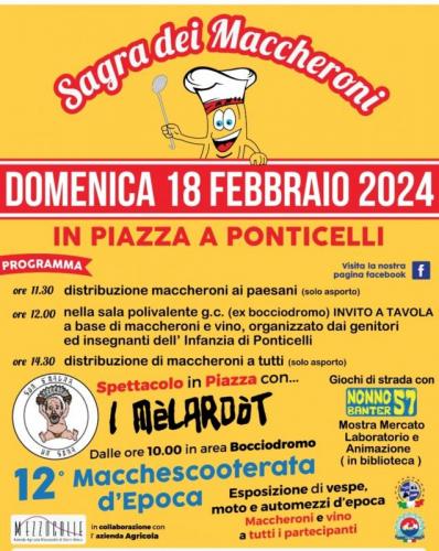 18 febbraio 2024 si svolge la Sagra Dei Maccheroni a Ponticelli di Imola (BO), la tradizionale sagra già attiva nei primi anni del secolo, organizzata dal Comitato Sagra dei Maccheroni di Ponticelli e sponsorizzazione sia dai paesani che da attività commerciali.
