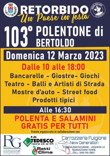 Quest'anno la tradizionale Sagra del Polentone si svolge Domenica 12 Marzo 2023 a Retorbido in Piazza Roma giunta alla 103a edizione.