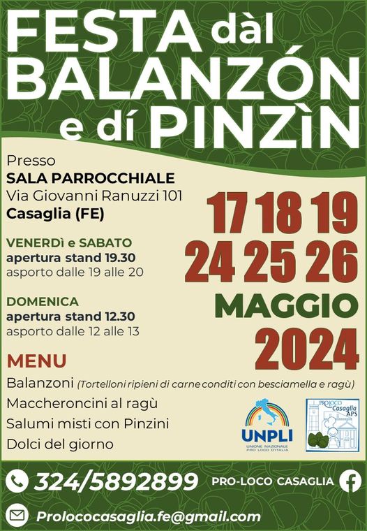 Festa del Balanzon e dal pinzin di San Giacomo a Casaglia di Ferrara nei giorni 17, 18, 19 e dal 24 al 26 Maggio 2024