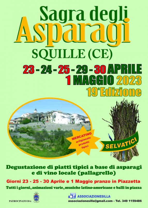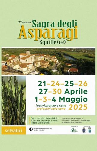 La 21a edizione della Sagra Degli Asparagi a Squille, frazione di Castel Campagnano (CE), si svoge nei giorni 21, 24, 25, 26, 27, 30 Aprile e 01, 03, 04 Maggio 2025.