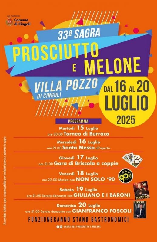 A Villa Pozzo, frazione del Comune di Cingoli in provincia di Macerata si svolge nei giorni dal 16 al 20 Luglio 2025 la 33a edizione della Sagra del Prosciutto e Melone.