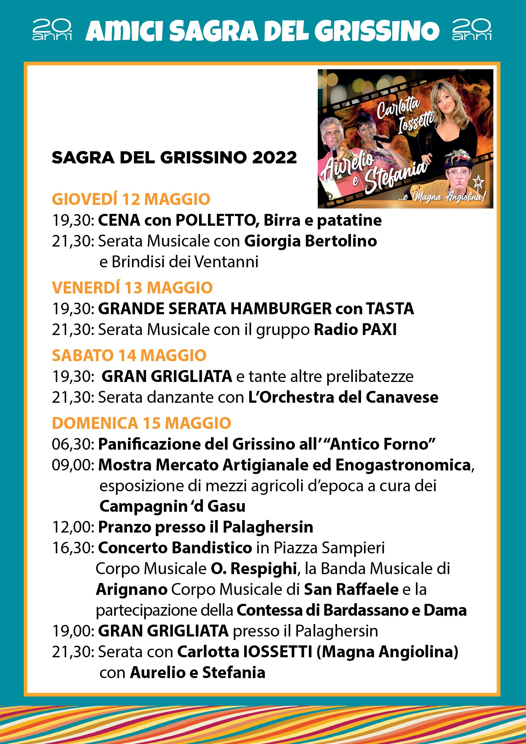 Dopo due anni di forzato stop ci apprestiamo a festeggiare non solo la Sagra del Grissino ma un importante momento di ripartenza delle manifestazioni simbolo della voglia di incontrarsi e di vivere in compagnia i nostri momenti di libertà.